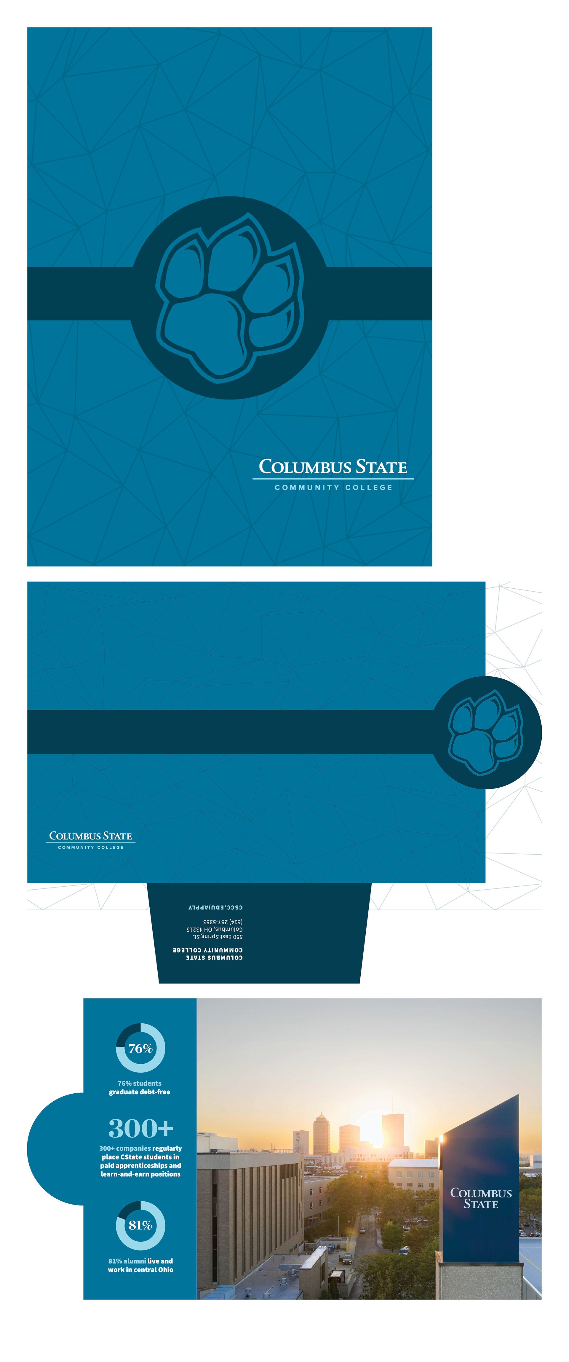 Admissions was in need of an update of their folder that all students receive when they are admitted to Columbus State that contains a variety of "next steps" information. We wanted this to be intriguing, memorable, and, most importantly, fun! This pocket folder opens up from the center, with the paw print circle as a die-cut. When you open it, you are hit with some top college stats and a gorgeous shot of campus and the Columbus city skyline. (2024)