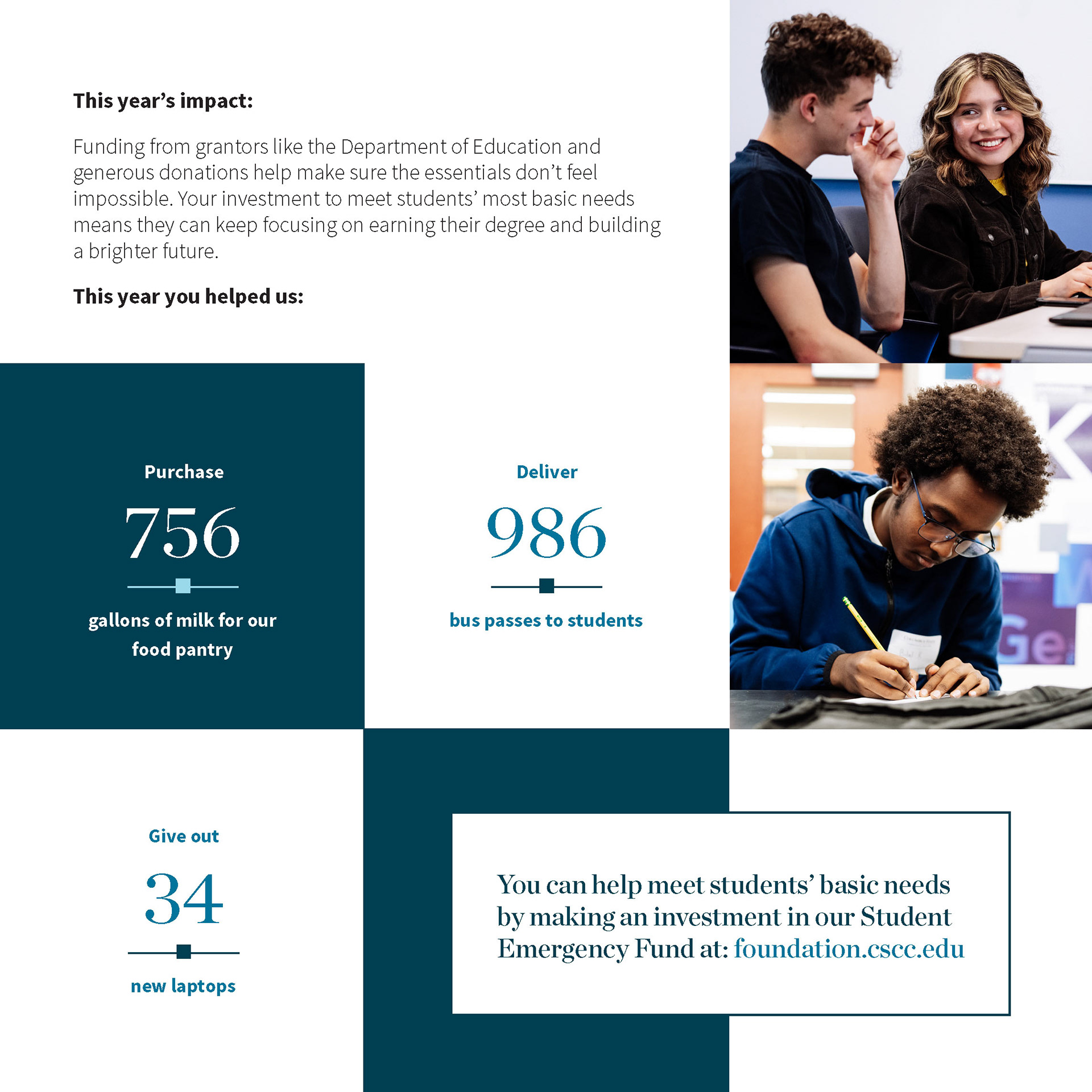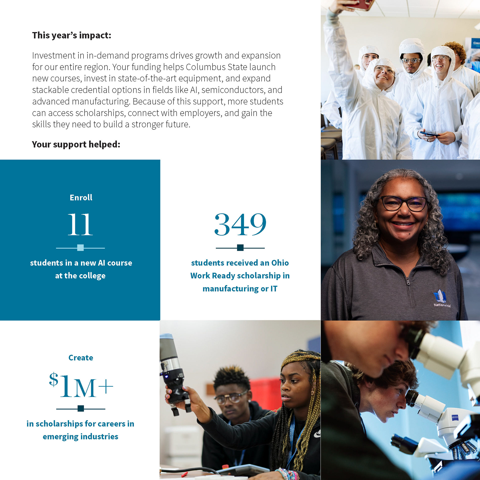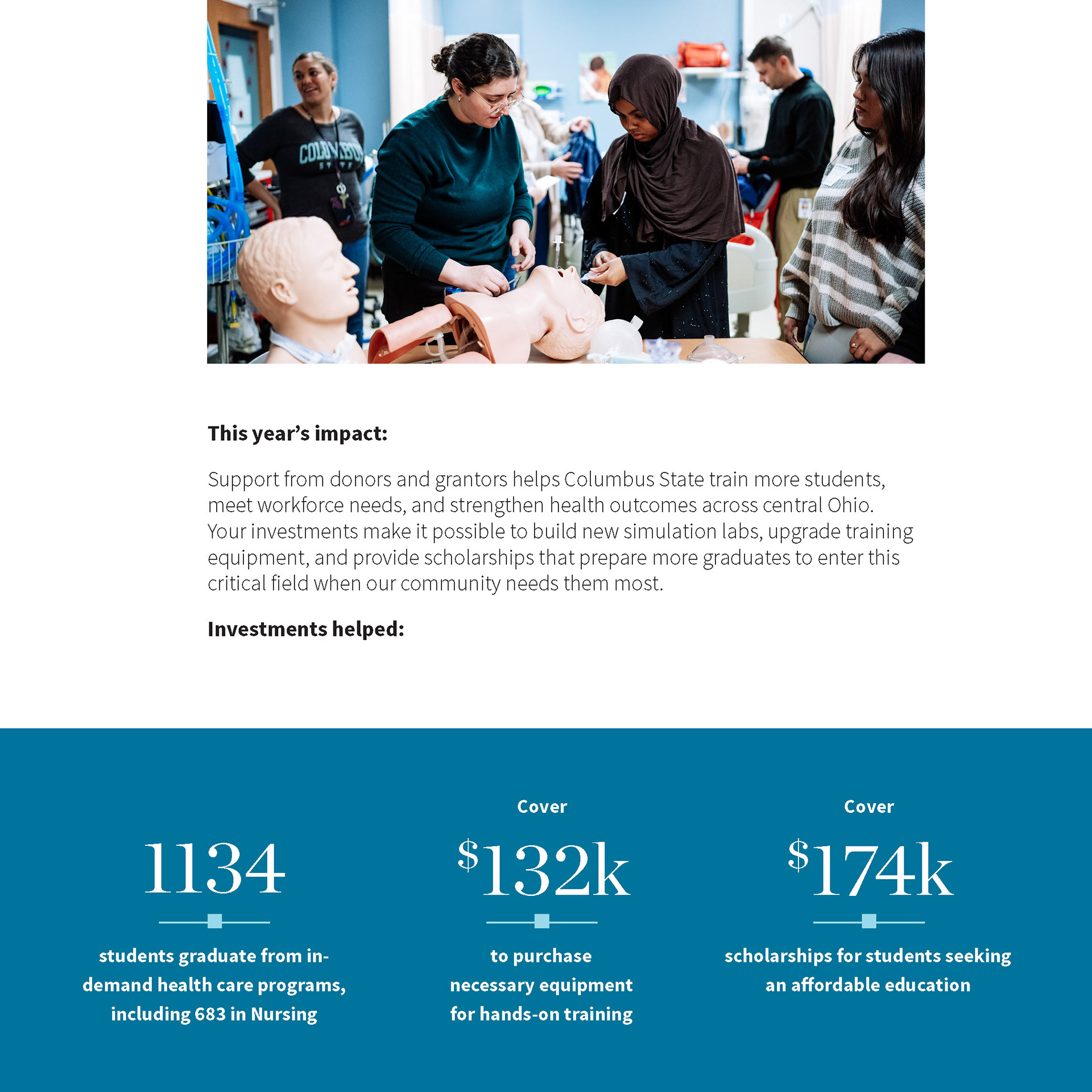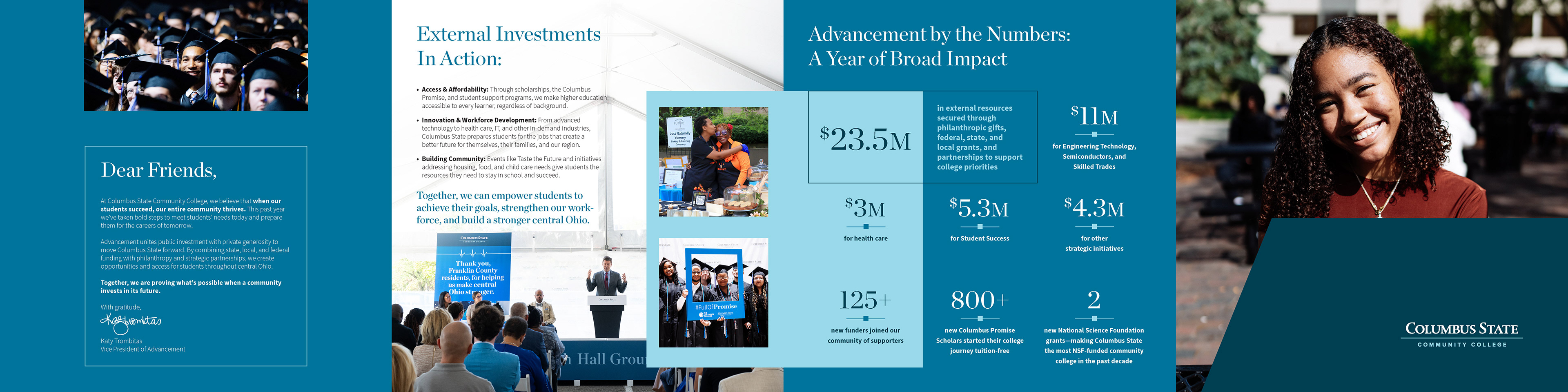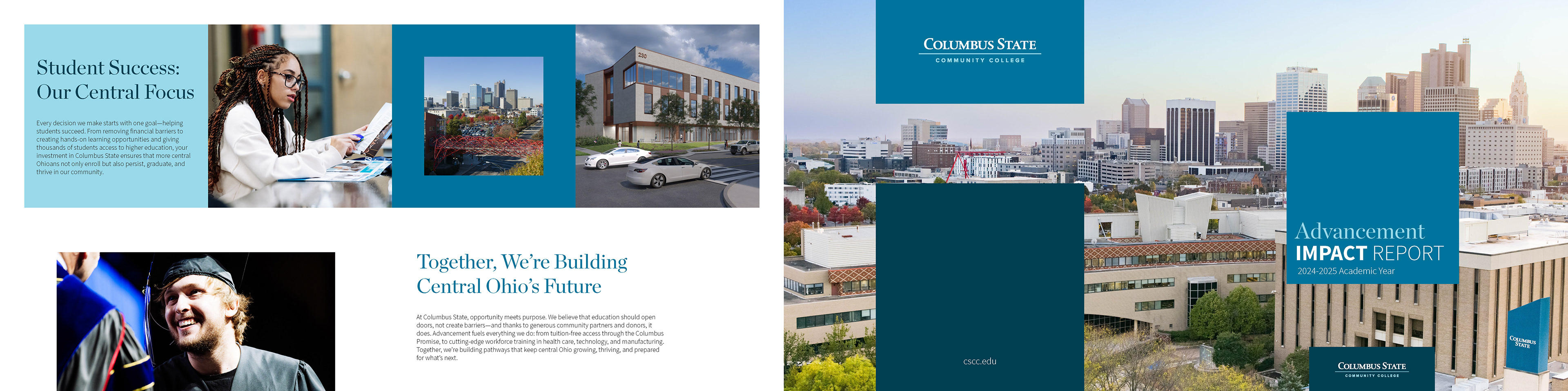 The Advancement Impact team needed a shift in their Impact Report from a data-heavy PDF to a mailed, creative, print piece that tells the impact of our donors' dollars. I crafted a smart, roll-fold folder that tells the story of our student success focuses, data, and support offered at Columbus State which then leads into individual handouts that are program and event-specific. We told our story, and folks responded so positively, one donor even called to increase their donation while flipping through her piece. (2025)