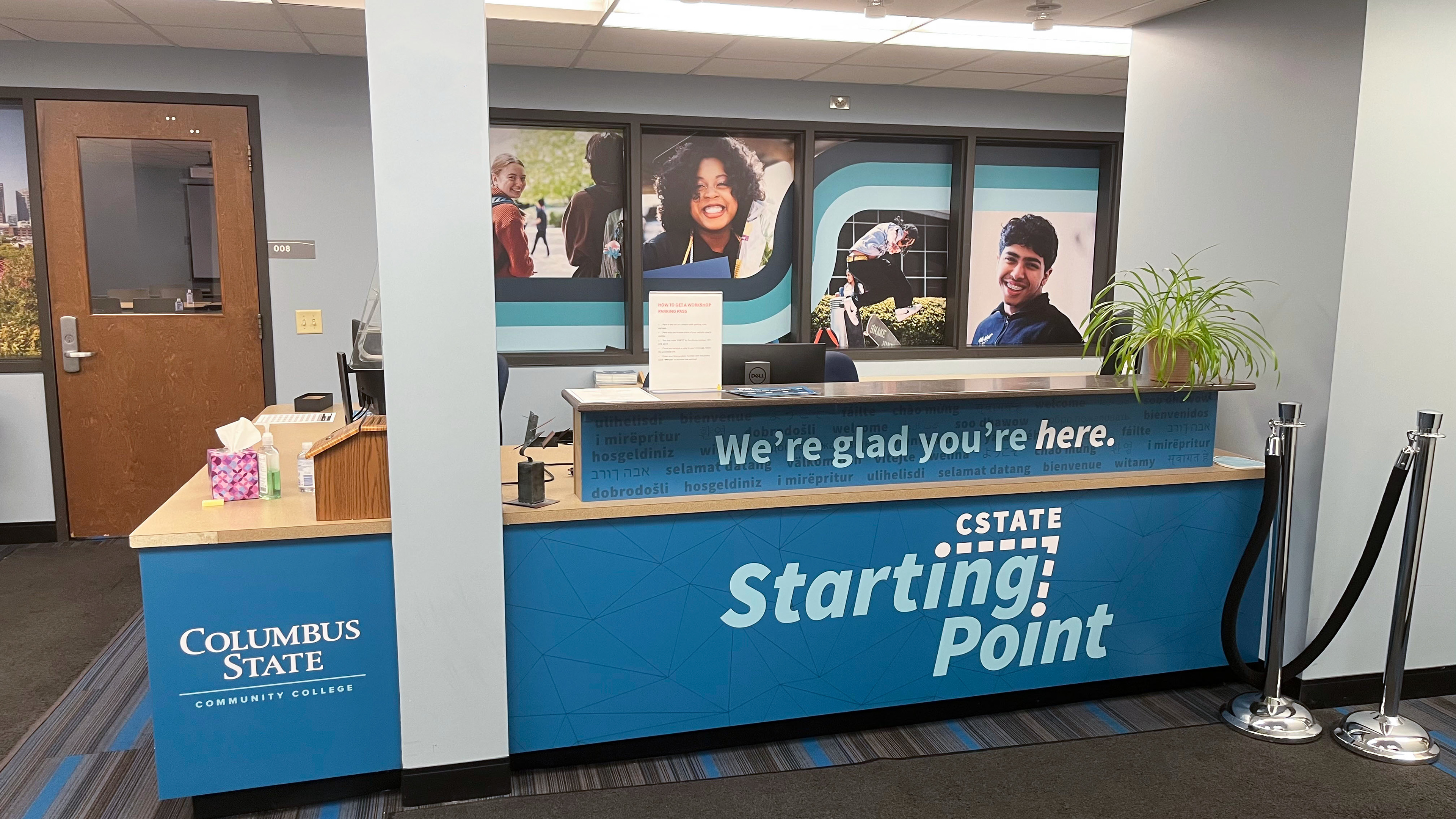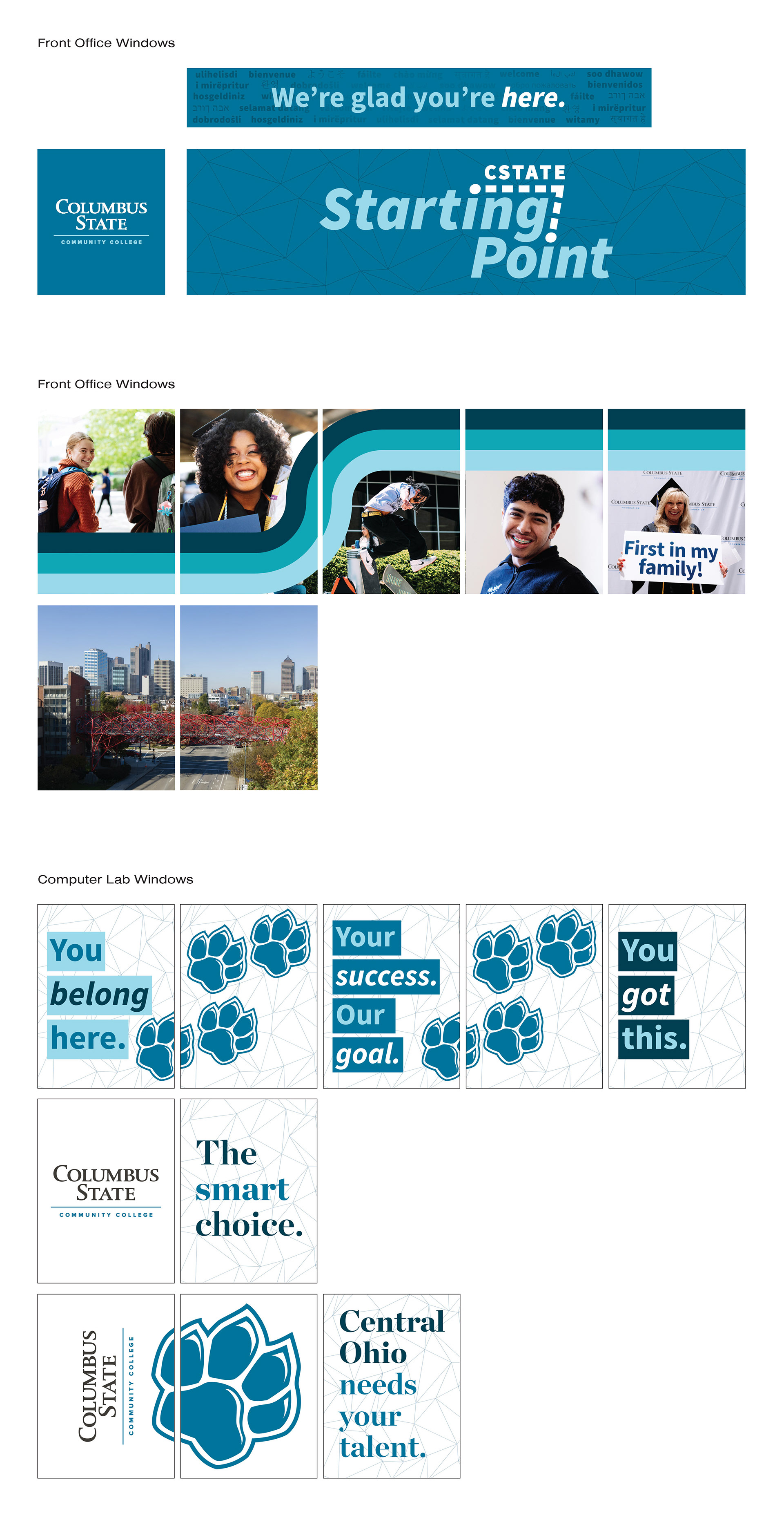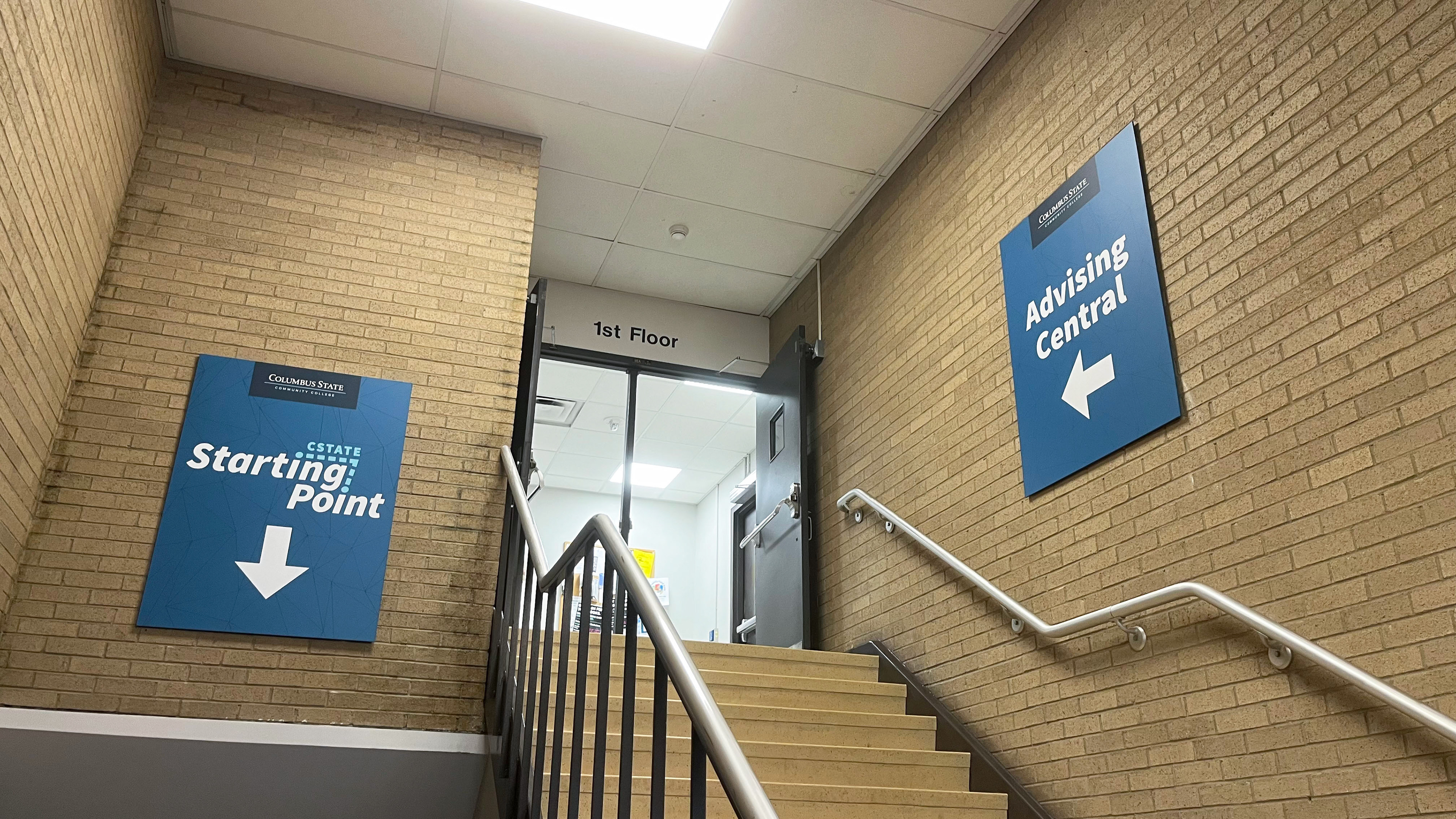 AQ002 was the name lovingly placed on an Admissions space with a variety of uses, including where students start their journey with Columbus State for testing, paperwork, and many other housekeeping items. The marketing team with leadership from our content teams on the project workshopped names and finally landed on CState Starting Point. Located on a lower-level building on campus, we needed signage to direct students and a bright design to account for lack of sunlight. (2025)