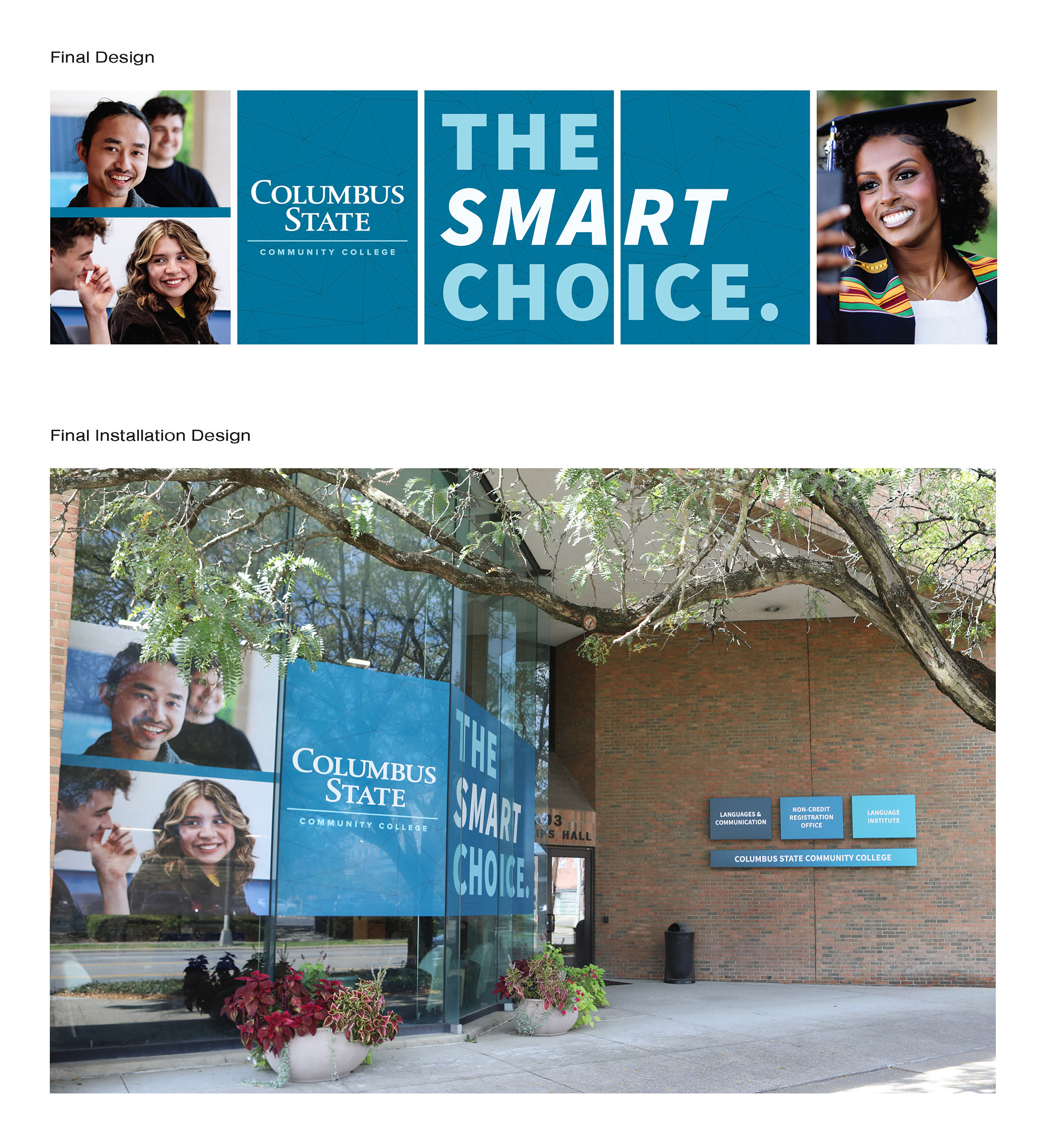 Columbus State acquired a new building in 2025, and moved into the new space. Since the building isn't directly on Columbus State's campus, we needed a way to brand the location so it connected to us. By using our primary brand blue and a key piece of messaging that we've been using throughout the community for several years, we composed an eye-catching design that is easily recognizable to the community and all who travel by Phillips Hall. (2025)