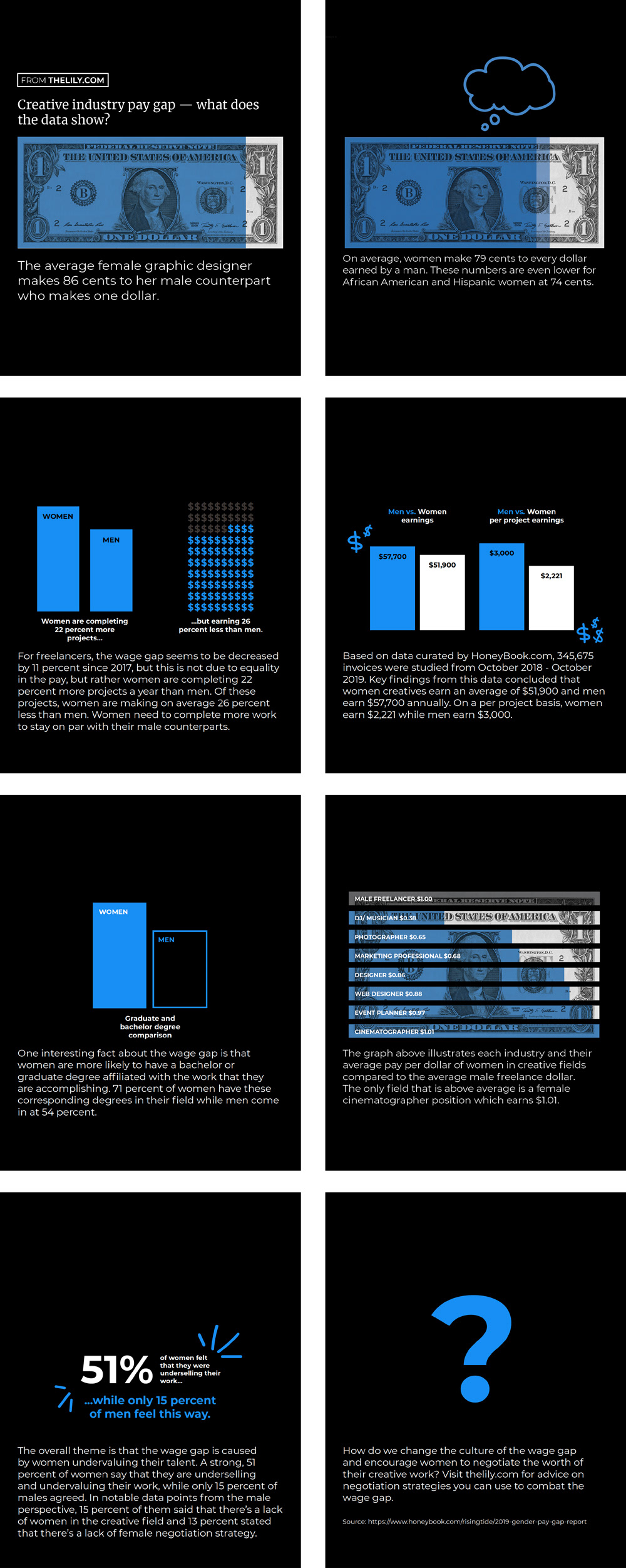Grad school assignment for "The Lily" instagram account. "The Lily" was a female-led reporting team for The Washington Post. My story focused on women in creative fields and the gap in pay between them and their male counterparts. (2020)